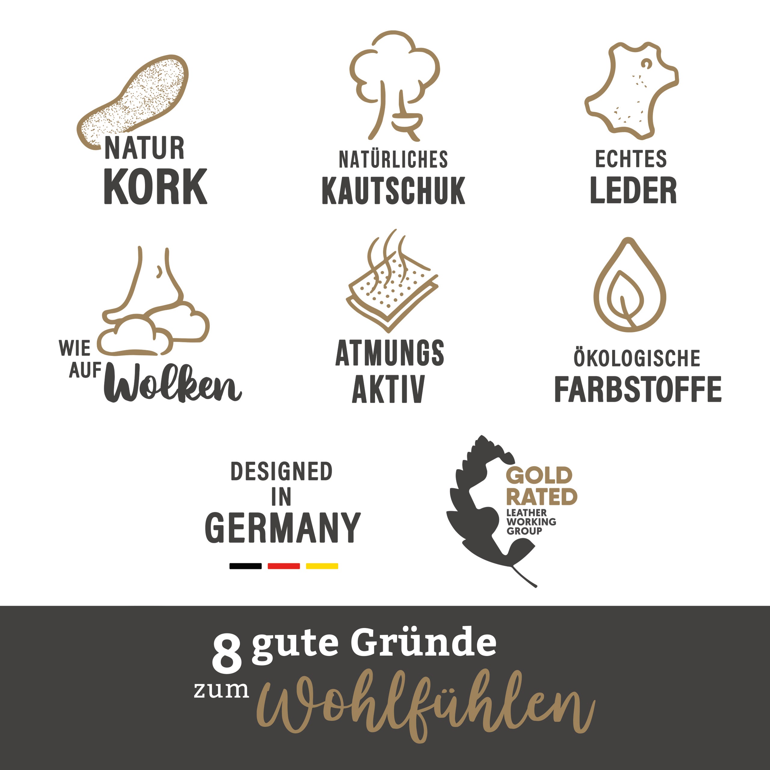 Für unsere Sandalen verwenden wir Naturkork aus Korkeichen. Der Kork sorgt für ein angenehmes Fußklima und die Kork-Kautschuk Mischung stützt und entlastet Ihre Füße zugleich.
