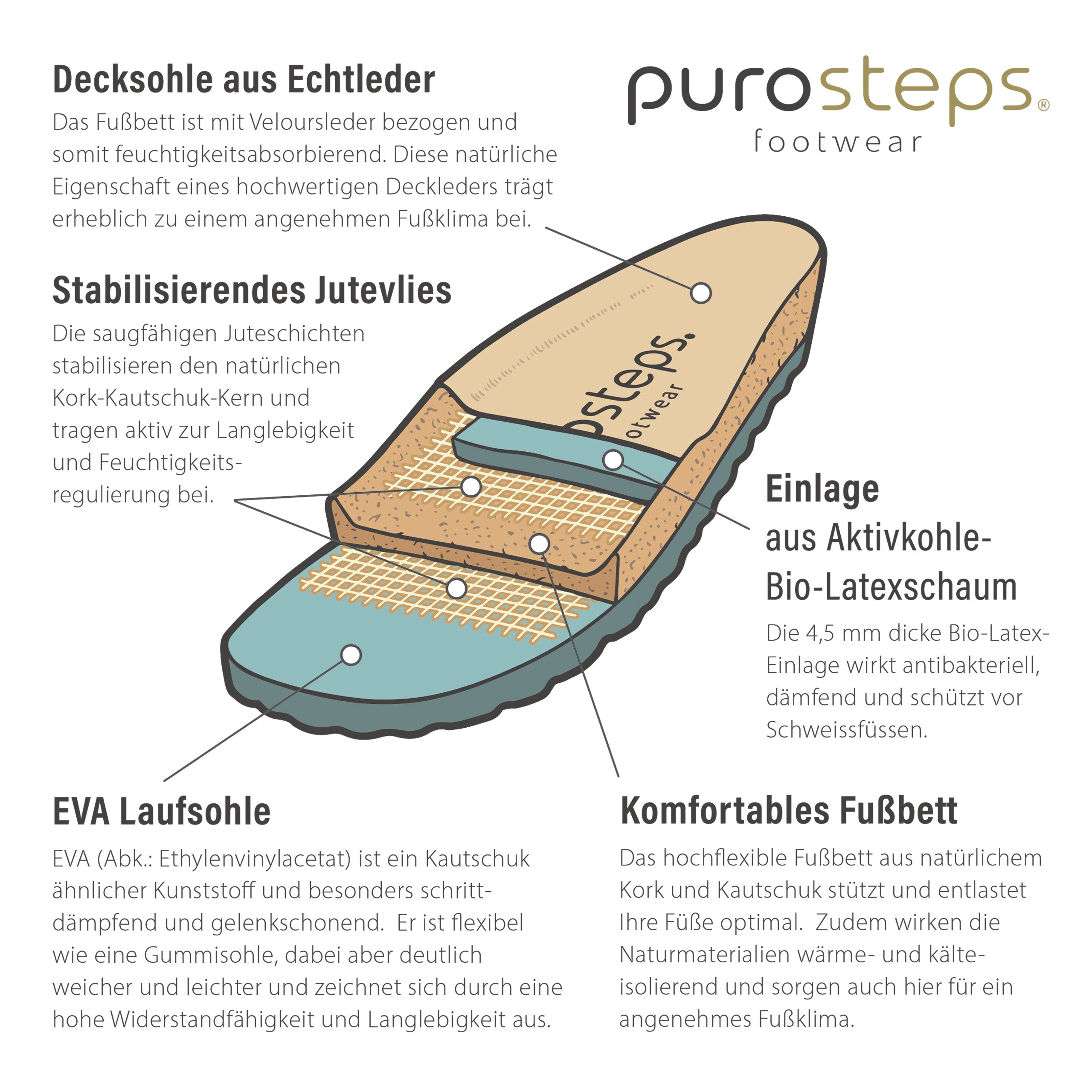 Unsere purosteps Kork Sandalen werden aus nachhaltigen Materialien, wie Naturkork und Naturkautschuk, hergestellt ! Zudem verwenden wir zertifizierte Leder (LWG-Gold Rated), die umweltschonend produziert werden !